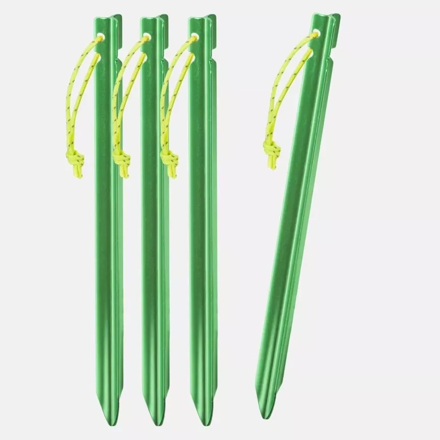 This set of four lightweight, profiled aluminum stakes is designed to secure tarps and shelters in any terrain. Built from rust-proof aluminum, each stake combines durability and minimal weight—only 12 g per piece—making them ideal for long treks and extended bivouacs.